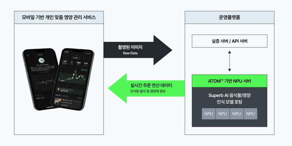 슈퍼브에이아이는 새로운 음식 카테고리를 추가하기 쉬운 유연한 모델 구축, 지속적인 학습을 통한 성능 개선, 대규모 동시 접속 시에도 안정적인 추론 성능 유지를 중장기 목표로 잡았습니다. 이러한 ‘음식물 디텍션 AI’ 고도화 로드맵을 수행하기 위해 성능과 비용 모든 면을 고려하여 슈퍼브에이아이는 리벨리온 NPU 기반 클라우드 서비스를 선택했습니다. 리벨리온의 NPU를 기반으로 한 클라우드 인프라는 GPU와 동등한 수준의 성능을 유지하면서도 전력 소모는 적어 높은 전성비를 가지고 있었고, 클라우드 기반 아키텍처로 모델 최적화와 서비스 확장이 가능했습니다.