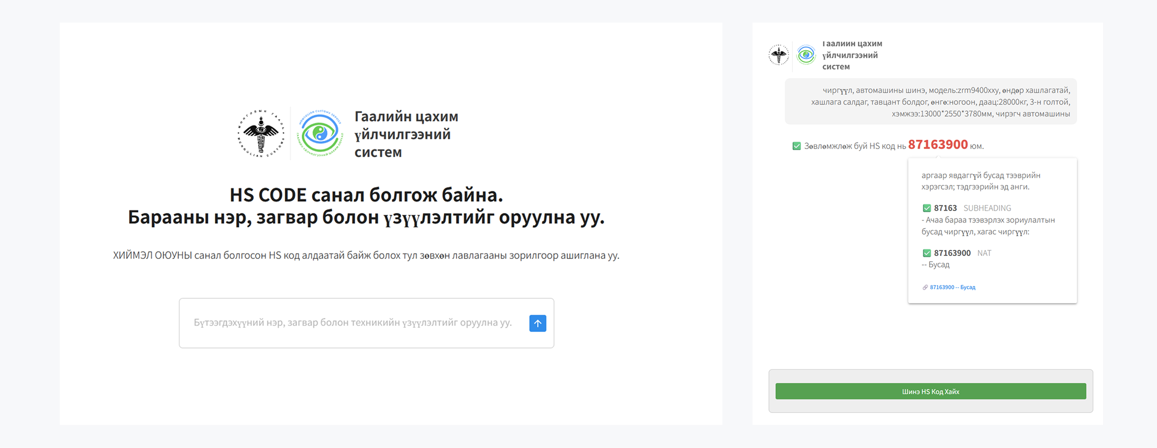 관세청은 매년 방대한 양의 수출입 신고서를 처리하며, 각 품목에 적합한 HS 코드(Harmonized System Code)를 정확하게 분류해야 하는 업무를 수행합니다. 그러나 실제 신고서에는 비정형적으로 작성된 상품명과 모델명, 언어가 혼재된 상세 설명이 포함되는 경우가 많아 담당자 간 분류 기준이 달라지거나 처리 시간이 길어지는 문제가 발생합니다. 또한 HS 코드는 관세 부과와 직접적으로 연결되는 민감한 정보이기 때문에, 높은 수준의 정확성이 요구됩니다. 몽골 관세청은 이러한 문제를 해결하기 위해 AI 기반 HS 코드 추천 챗봇을 도입하였습니다.