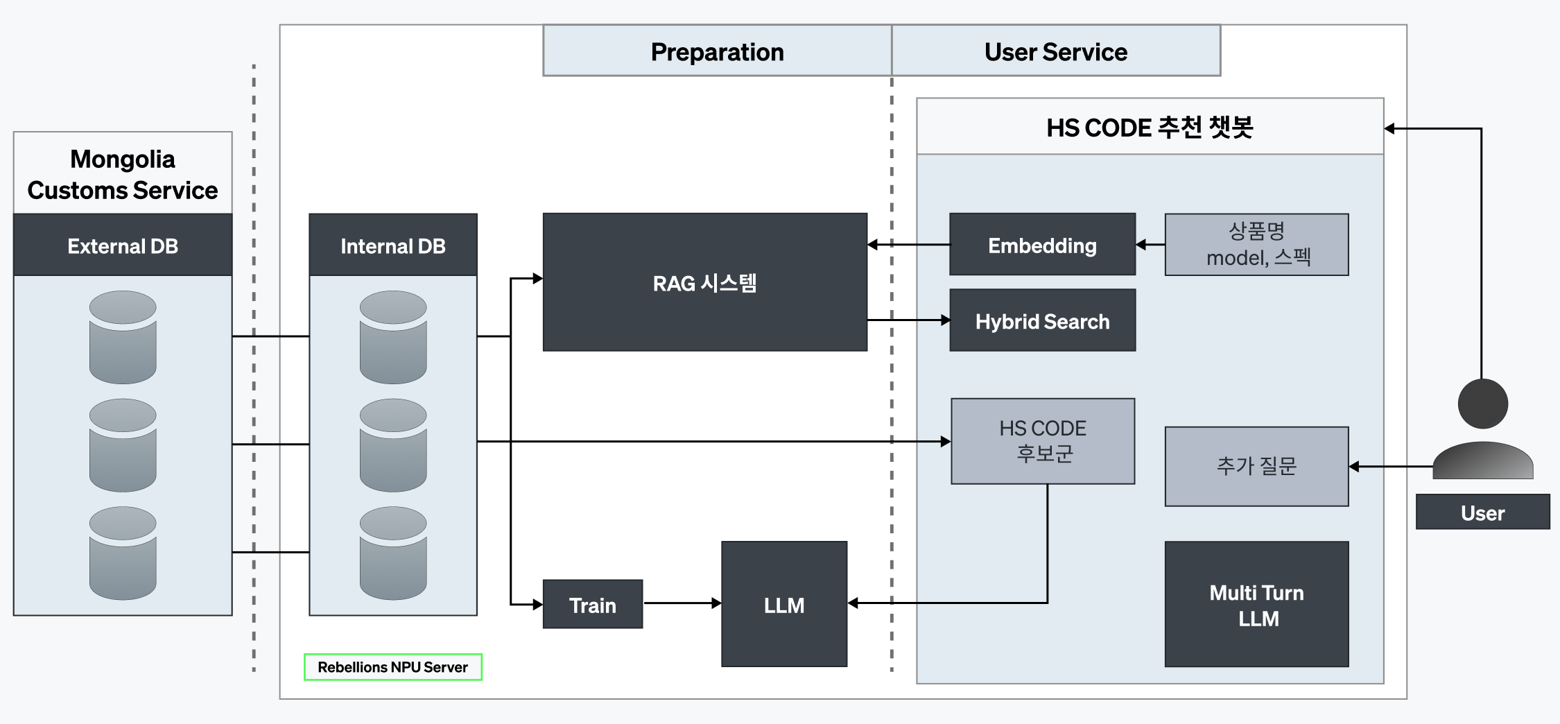 몽골 관세청은 HS 코드 분류 자동화를 위해 RAG 기반 Hybrid Search와 LLM 기반 Multi-turn 추론을 결합한 HS 코드 추천 AI 챗봇을 리벨리온의 ATOM™ NPU 기반으로 구축하였습니다. 본 서비스는 수출입 신고인이 입력한 품명 및 설명 정보를 기반으로, HS 코드 분류 기준에 따라 가장 적합한 HS 코드를 자동 추천하며, 신고인이 보다 정확한 HS 코드를 신고할 수 있게 하여 관세 업무 효율화에 기여합니다. 챗봇은 자연어처리 기반의 대화형 인터페이스를 제공하며, 몽골어 사용자 입력을 분석하여 품목의 특징을 이해하고, 유사 품목 정보, HS 코드 설명정보 등을 참고하여 적절한 HS 코드 후보를 제시합니다. 더 나아가, 사용자의 피드백을 바탕으로 추천 결과를 조정하거나 추가 정보를 요청할 수 있습니다. 이를 통해 신고인의 분류 오류를 줄이고, 관세행정의 투명성과 신뢰도를 높이며, 업무처리 시간을 단축할 수 있습니다.