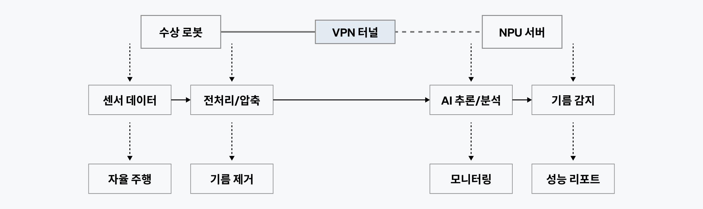 에코피스는 리벨리온 ATOM™ NPU 기반의 중앙 서버를 도입하여 지능형 수질 정화 로봇 시스템을 구축했습니다. 두바이 Al Jadaf 항만에서 운용되는 에코봇이 촬영한 영상 데이터를 전송하면, 아부다비에 위치한 NPU 서버는 객체 탐지 모델로 오염물을 정밀 식별하는 동시에 심도 추정 모델을 통해 3D 거리를 산출합니다. 로봇은 해당 결과를 수신하여 오염물에 접근한 뒤, 오일 회수 펌프를 가동하여 내부 시스템의 유분리 구성 요소 및 필터 설계를 통한 흡입·여과 작업을 수행합니다.