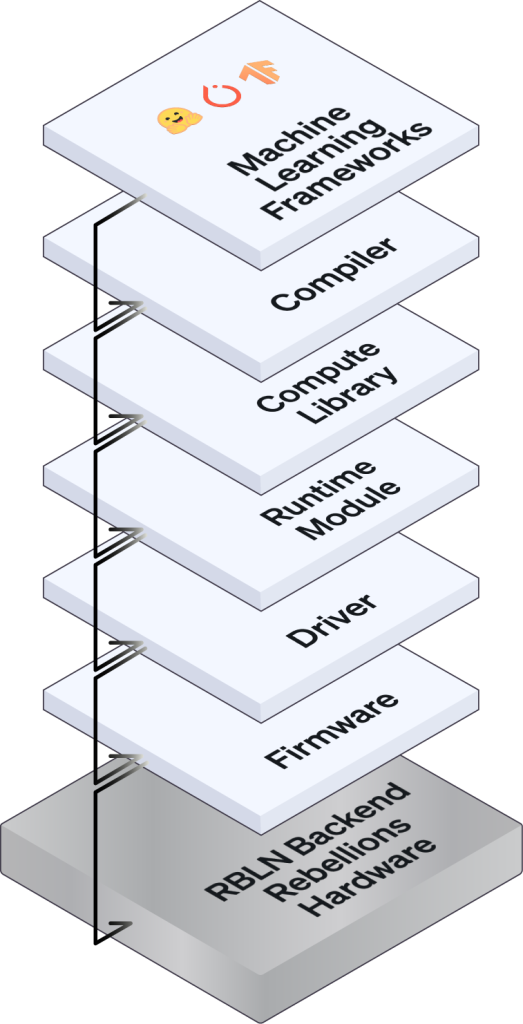 - 모듈형 컴파일러 스택: 적응성은 모듈성에서 시작됩니다. 리벨리온의 컴파일러는 200개 이상의 모델을 지원하는 풍부한 연산 프리미티브 라이브러리를 갖추고 있으며, 트랜스포머(Transformer), 컨볼루션, 디퓨전(Diffusion) 모델을 모두 처리할 수 있는 프론트엔드, 그리고 하드웨어 최적화 코드를 자동 생성하는 백엔드로 구성되어 있습니다. 개별 튜닝 없이도 모델별 커널을 효율적으로 변환합니다.