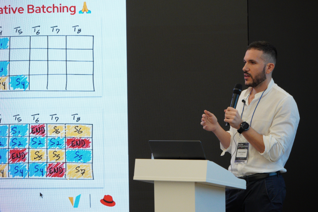 첫 번째 세션은 레드햇 시니어 머신 러닝 엔지니어인 니콜로 루케시(Nicolo Lucchesi)가 “vLLM은 가장 빠르고 사용하기 쉬운 오픈 소스 LLM 추론 및 서빙 엔진을 지향한다”는 프로젝트 소개로 발표를 시작했습니다. 그는 LLM 추론 시 가장 큰 성능 병목 요소인 KV 캐시 메모리 관리 문제를 해결하는 PagedAttention 기술을 이해하기 쉽게 소개했습니다. 이 기술은 필요할 때만 물리 메모리에 할당하여 메모리 낭비를 최대 90%까지 줄일 수 있습니다.
